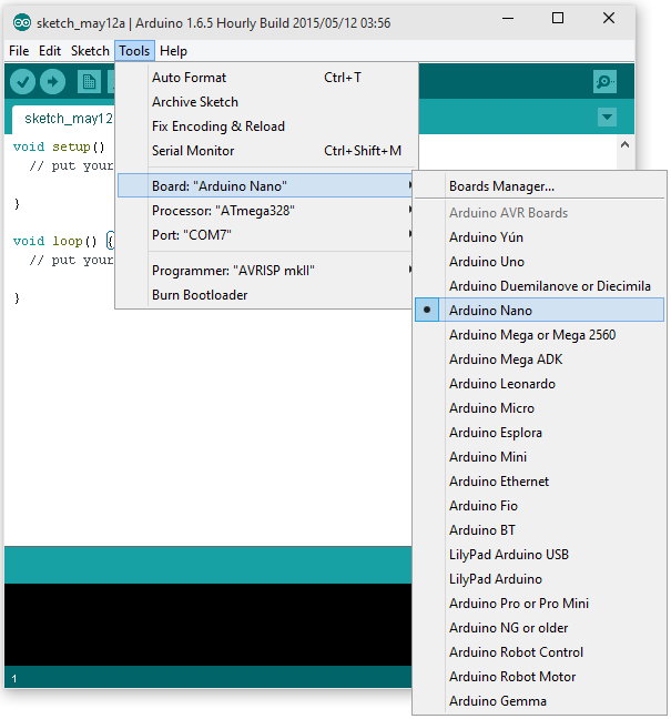 To set up our Nano, we need to select Arduino Nano in the Board menu: